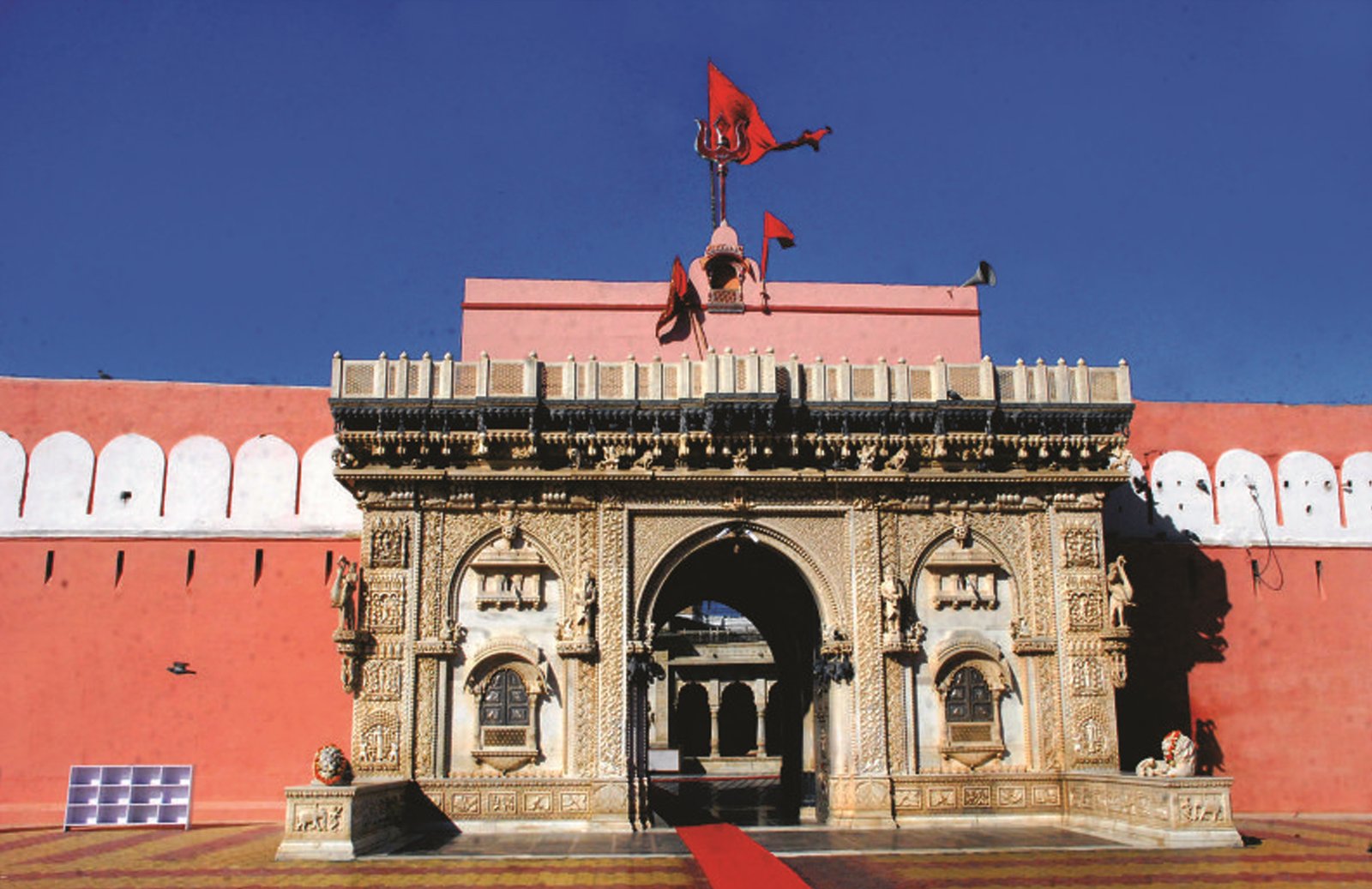 SHIV BARI TEMPLE Located just 6 kilometres from Bikaner, this Shiva temple is known as Laleshwar Mahadev Mandir and is fortified by a high wall. It was commissioned and built by Maharaja Doongar Singh in the 19th century to commemorate his father Maharaja Lal Singh. The highlights of this red stone temple are beautiful wall paintings, the four-faced black marble Shiva statue and a bronze Nandi statue facing the Shiva-Lingam. The temple also houses two large reservoirs of water known as bawaris.
